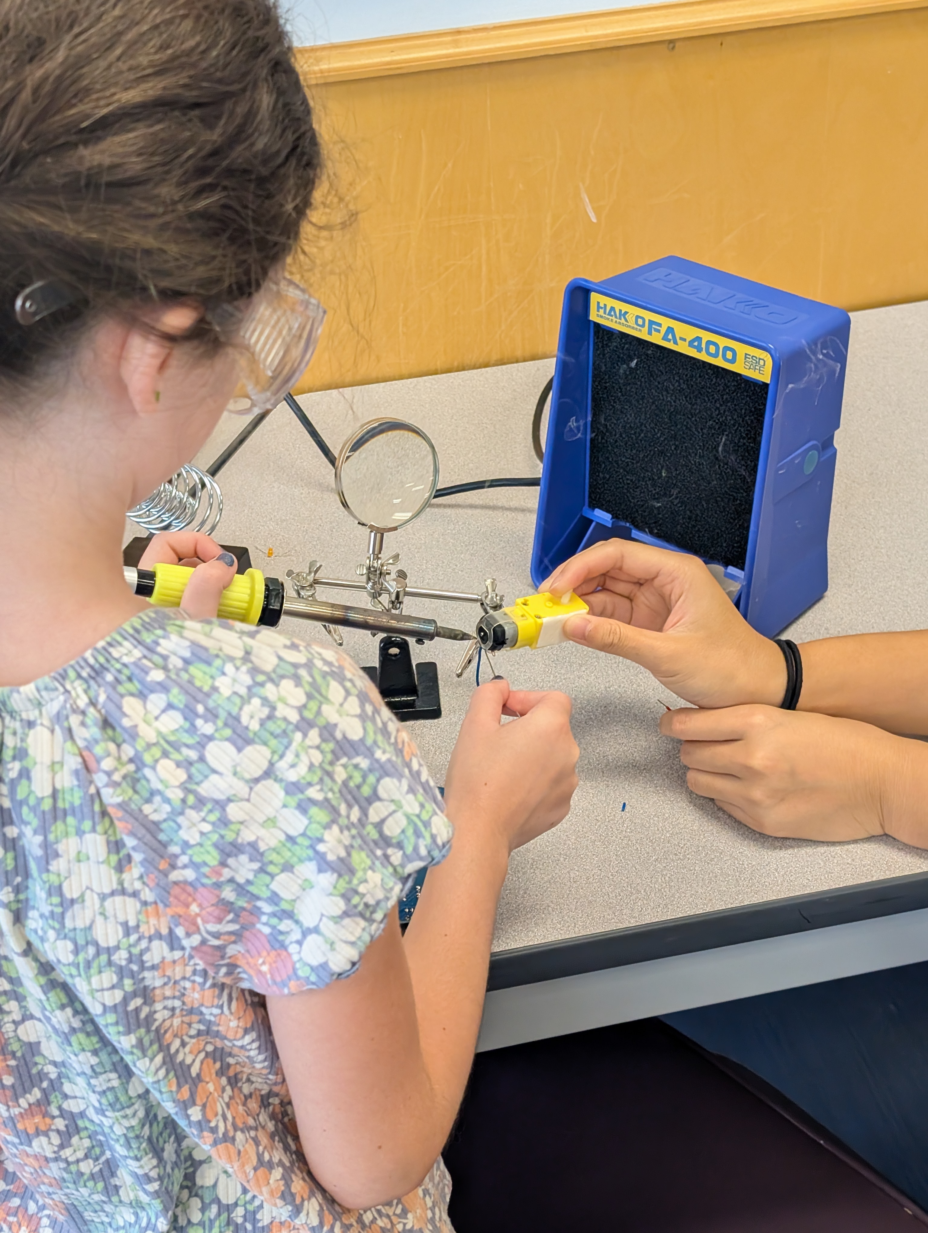 In the first week, of Camp VCC we partnered with the Fashion department to offer A Mixed Bag, where campers explored surface design, patchwork, and sewing, ultimately combining their creations into a one-of-a-kind tote bag to take home. In the second week, we partnered with the Electronics department to present Circuit Masters, where campers learned the basics of circuitry and soldering by building a weather station and designing a line-following car—sparking plenty of excitement as they watched their projects come to life.